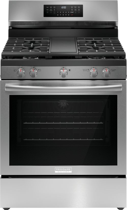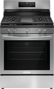 The Frigidaire Gallery 30" Rear Control Gas Range features our most powerful and advanced convection system, Total Convection, enabling so many cooking modes like No Preheat, Air Fry, Slow Cook, Steam Bake, Steam Roast, Air Sous Vide, Convection Roast, Convection Bake and more! The flexible five burner cooktop includes a powerful 18,000 BTU Quick Boil Burner and a center oval burner with an integrated cast iron griddle. Also includes our fingerprint resistant, Smudge-Proof® Stainless Steel finish.